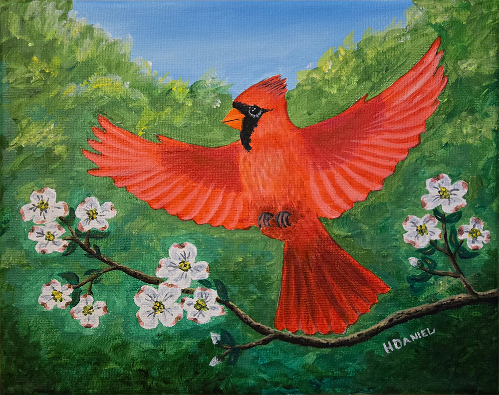 “Cardinal in Flight with Dogwood Blossoms” is an 8″x10″ acrylic on canvas. The cardinal is North Carolina’s state bird and the flowering Dogwood is the state flower. We have several cardinal couples around our house this spring. Their cheerful calls and flashy colors are an added accent to the beauty of the Raleigh flowering shrubs. Signed lower right.