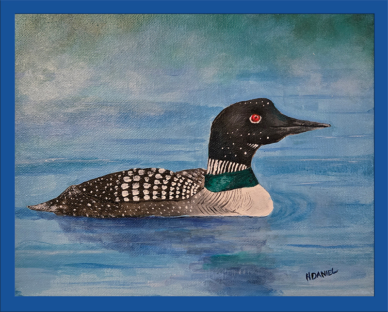 This is an original painting of a Common Loon by Hugh Daniel, using professional quality acrylics on 8″ x 10″ stretched canvas and is varnished with gloss varnish for protection and long-life. Signed in lower right. The Common Loon is the Minnesota state bird. Framed in a blue frame, framed size 9″ x 11″. Not available as an NFT.