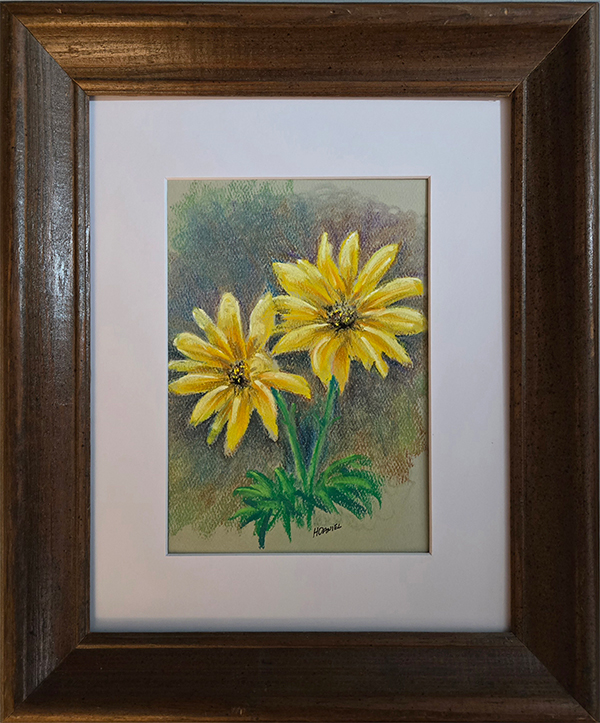 With spring around the corner, this addition to floral pastels series, “Daisies Pastel″ is a 7″x5” pastel drawing on light khaki green paper in an 8″x10 white mat. Framed in a 12.5″ x 10.5″ wooden frame.