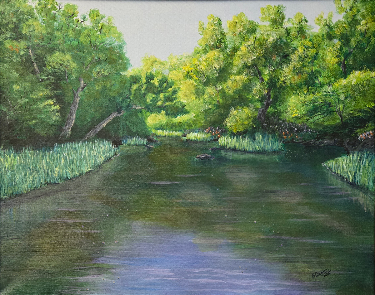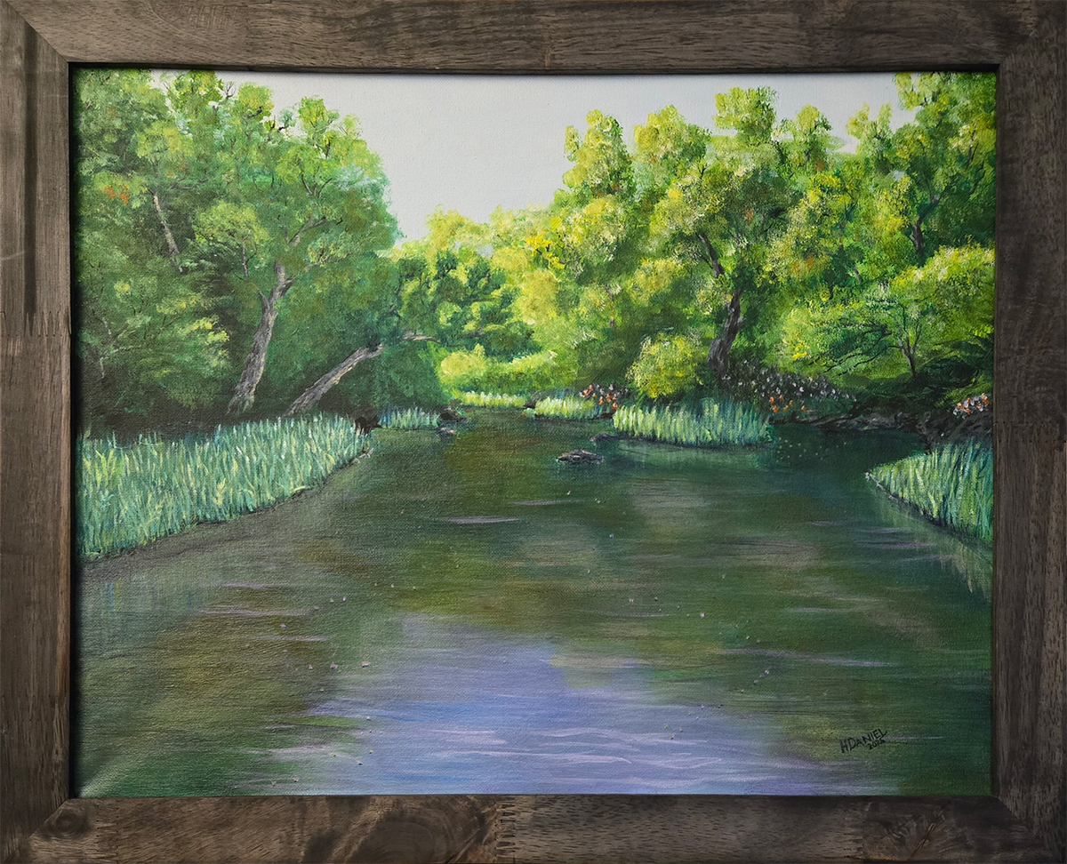 “Eno River Reflections” is a 16″ x 20″ acrylic on stretched canvas. It is based on a reference photo that I took of the Eno River at the Eno River State Park near Durham, North Carolina. It was taken looking south in the morning, near the Cox Mountain Trailhead. Rivers have always played an important, emotional role in my life, influenced by having grown up on the Stones River in Tennessee.