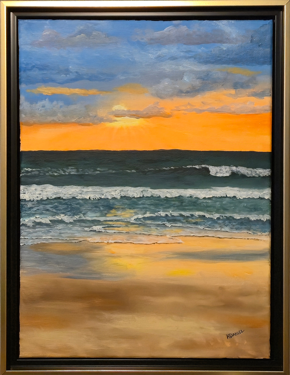 “Ormond Beach Sunrise” is a 16″ x 12″ acrylic painting on canvas by Hugh Daniel. Based on a reference photo taken by a friend and used with permission. This is one of my favorite paintings and it seemed to just flow from my brushes to the canvas. The colors range from blues to brilliant orange to deep teal to browns and tans for the sand. Sunrise is always a magical time at the beach and I feel this painting captures that sensation. Framed in a black and gold float frame, size 18″ x 14″.