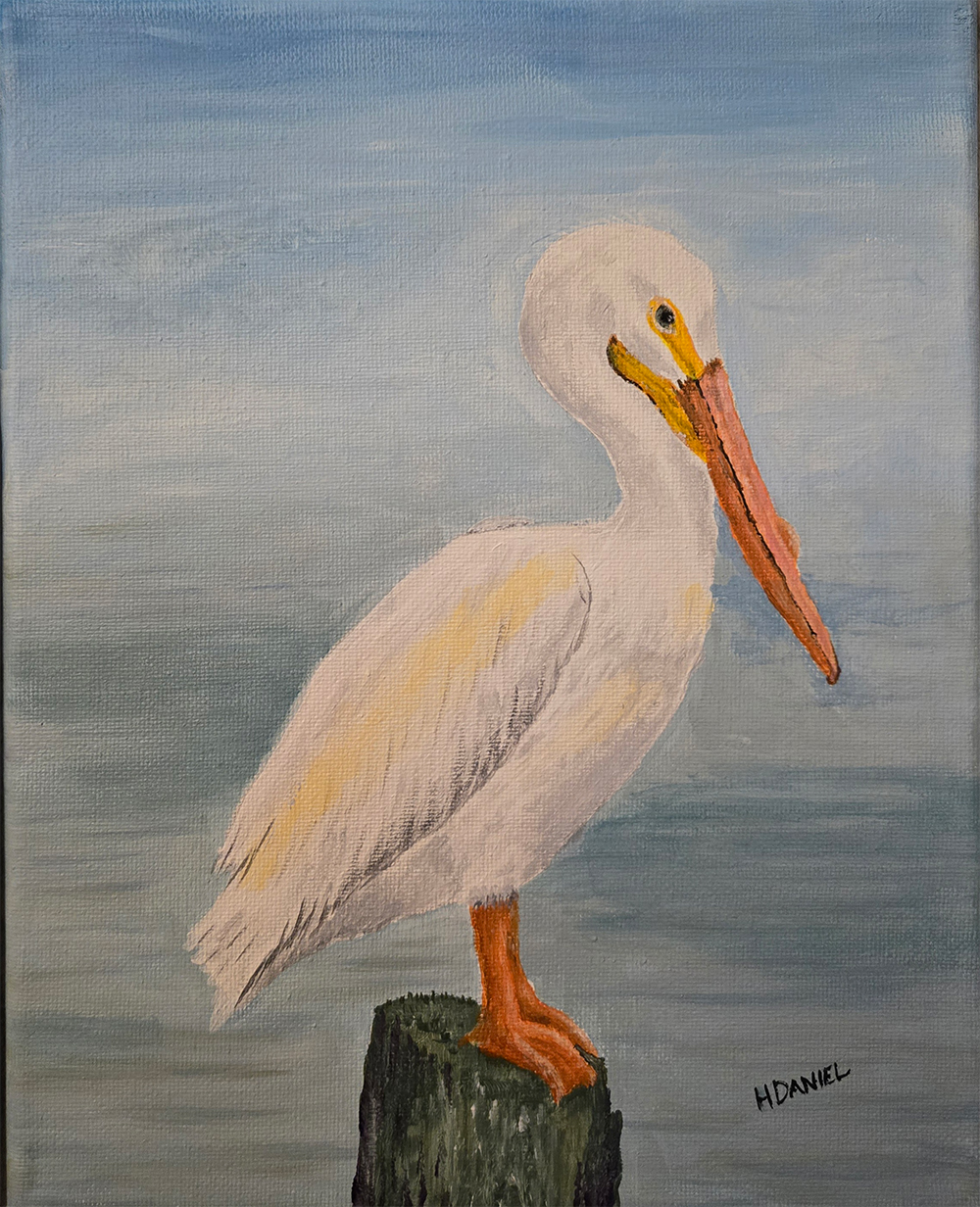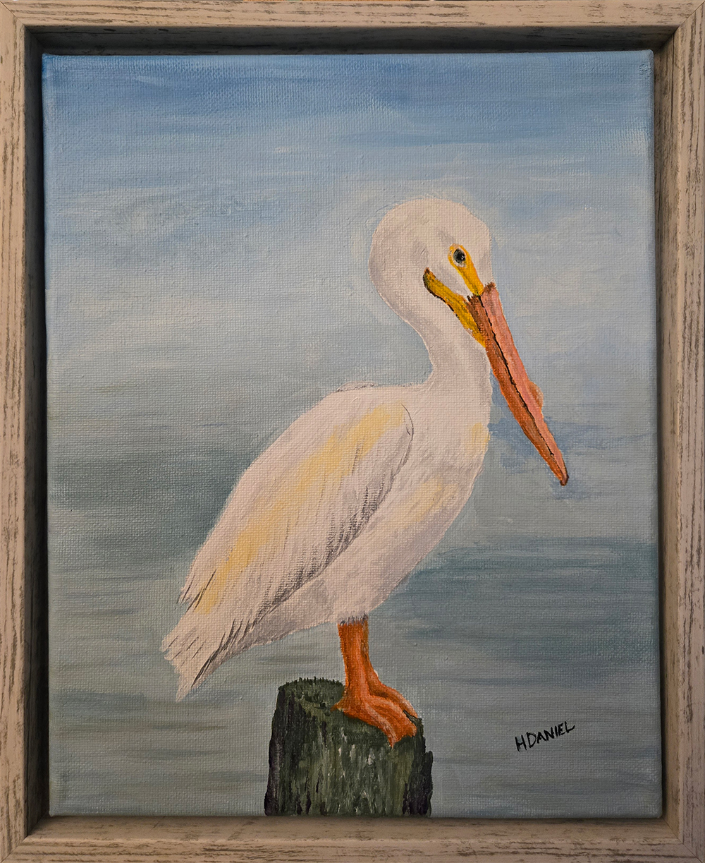 “Pelican on a Misty Morning” is a 10″ x 8″ acrylic on canvas painting by Hugh Daniel. Framed in an 11″ x 9″ sand-colored floating frame. A trip to the beach always inspires paintings of iconic ocean memories. Watching pelicans soar over the waves and perch on pilings are pleasant memories.
