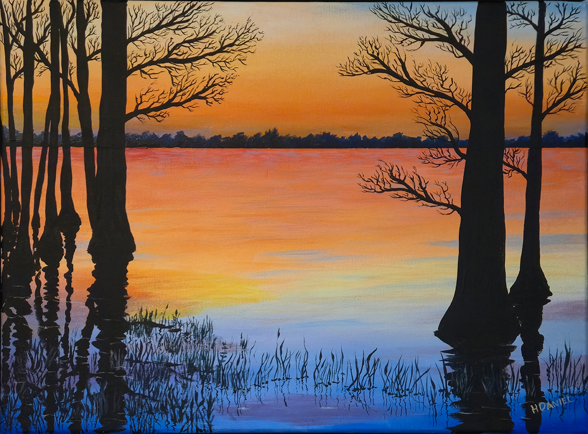 This is a Giclee print of the 12″ x 16″ painting, “Reelfoot Lake Revisited.” The dark shadows from the cyprus trees are a stark contrast with the vivid colors of the sunset. Reelfoot Lake is a protected natural area; a vital stopping point for migrating birds and has a large population of nesting Bald Eagles.