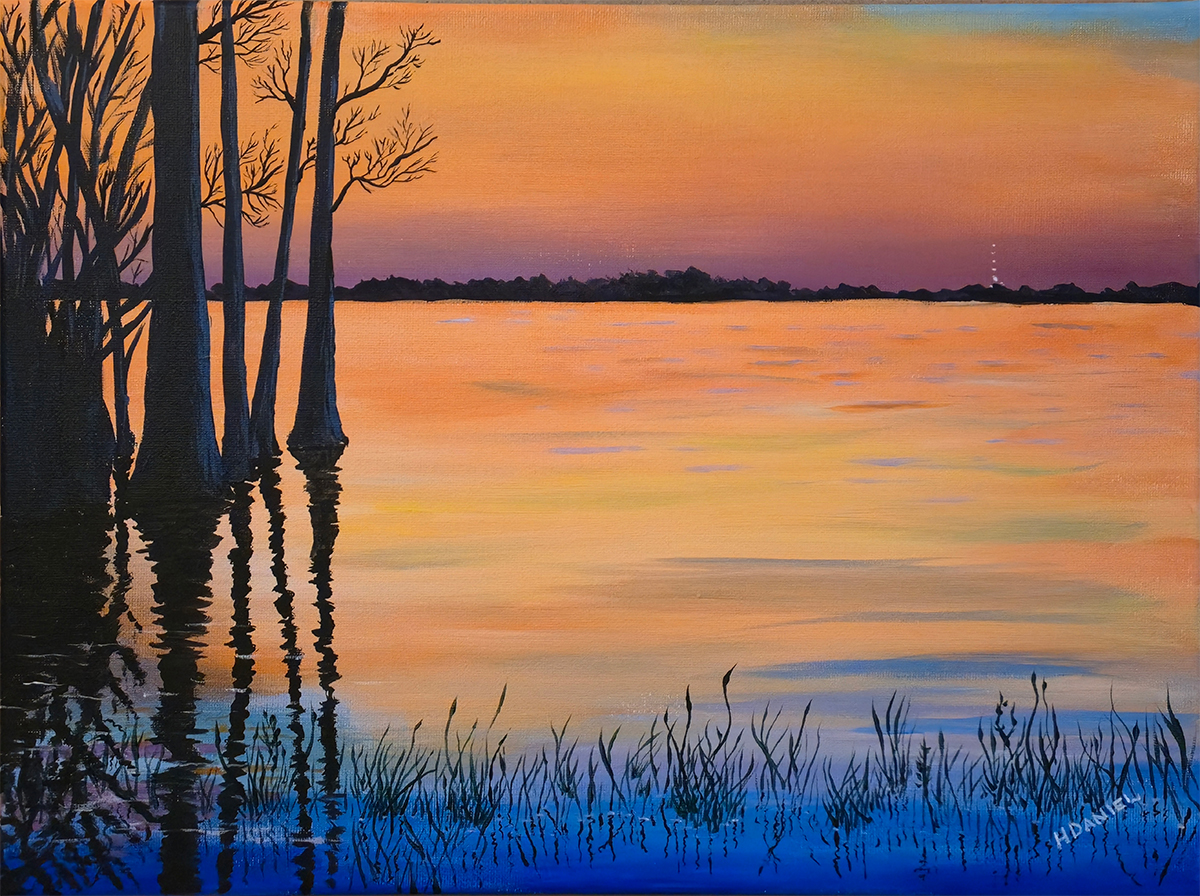 “Reelfoot Lake Sunset” is a 12″ x 16″ acrylic painting on canvas. The cyprus trees cast long shadows on the lake contrasting with the vivid colors of the sunset. From a reference photo by a friend, used by permission. Framed in a black floating frame. Framed size 13″ x 17″.