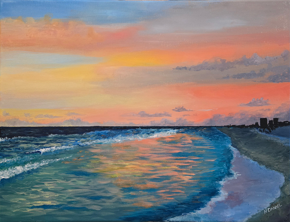 “St. Andrews Beach Sunrise” is a 12″ x 16″ acrylic on stretched canvas painting. Loosely based on a reference photo taken by a friend at St. Andrews State Park in Florida. This is one of my favorite vacation spots and I’ve walked this beach many times with my son and close friends.