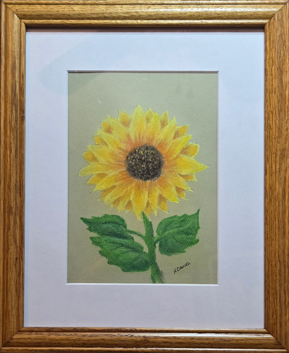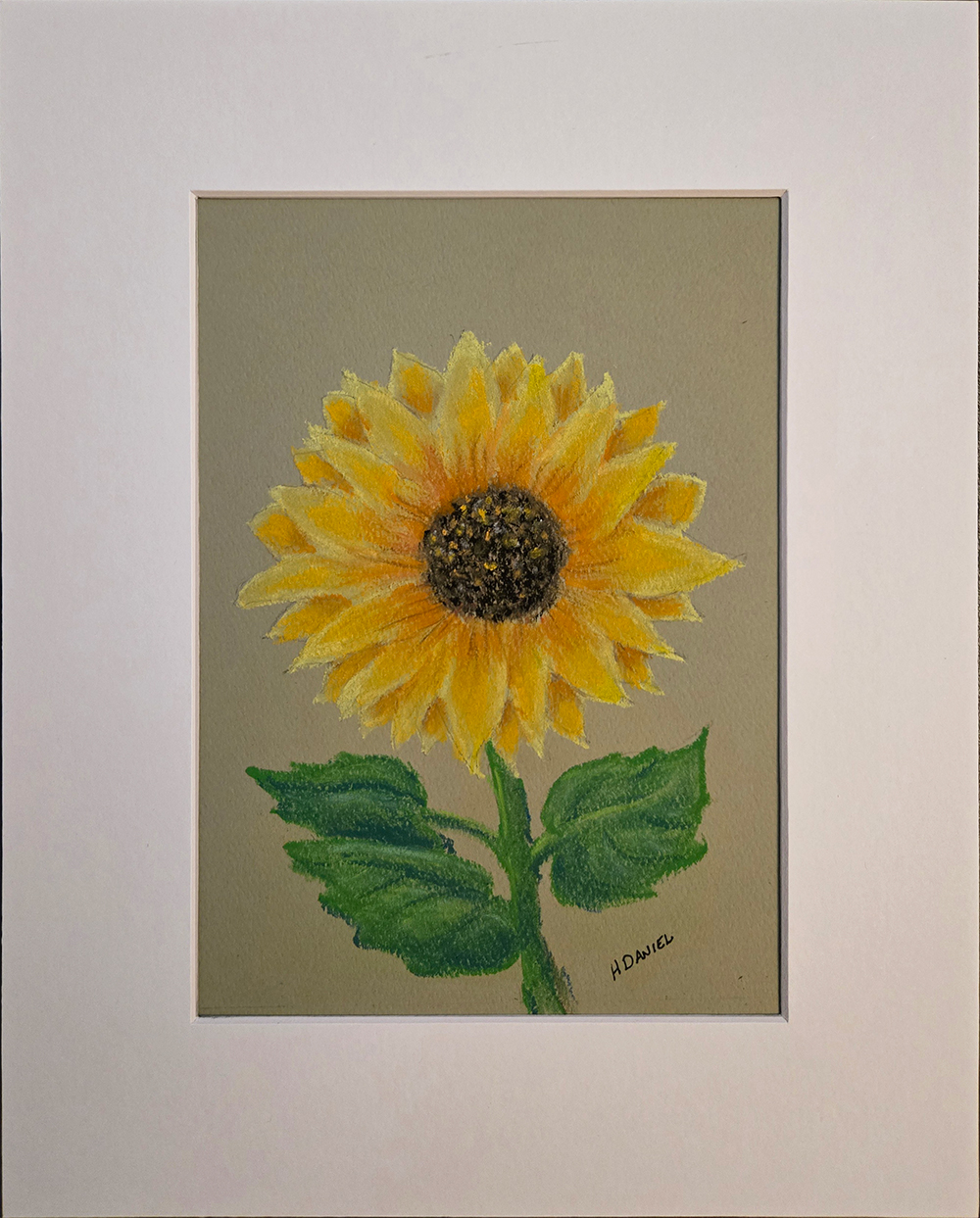 In celebration of summer and as part of my floral pastels series, “Sunflower Pastel 01″ is a 7″x5” pastel drawing on light khaki green paper in an 8″x10 white mat. Framed.